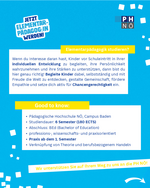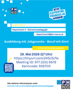 | Online-Informationsabend Bachelorstudium Elementarpädagogik 19. Mai 2026, 17 bis 18 Uhr ph-noe.zoom.us/j/97721016678 Meeting-ID: 977 2101 6678 Kenncode: 939700 |