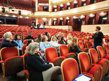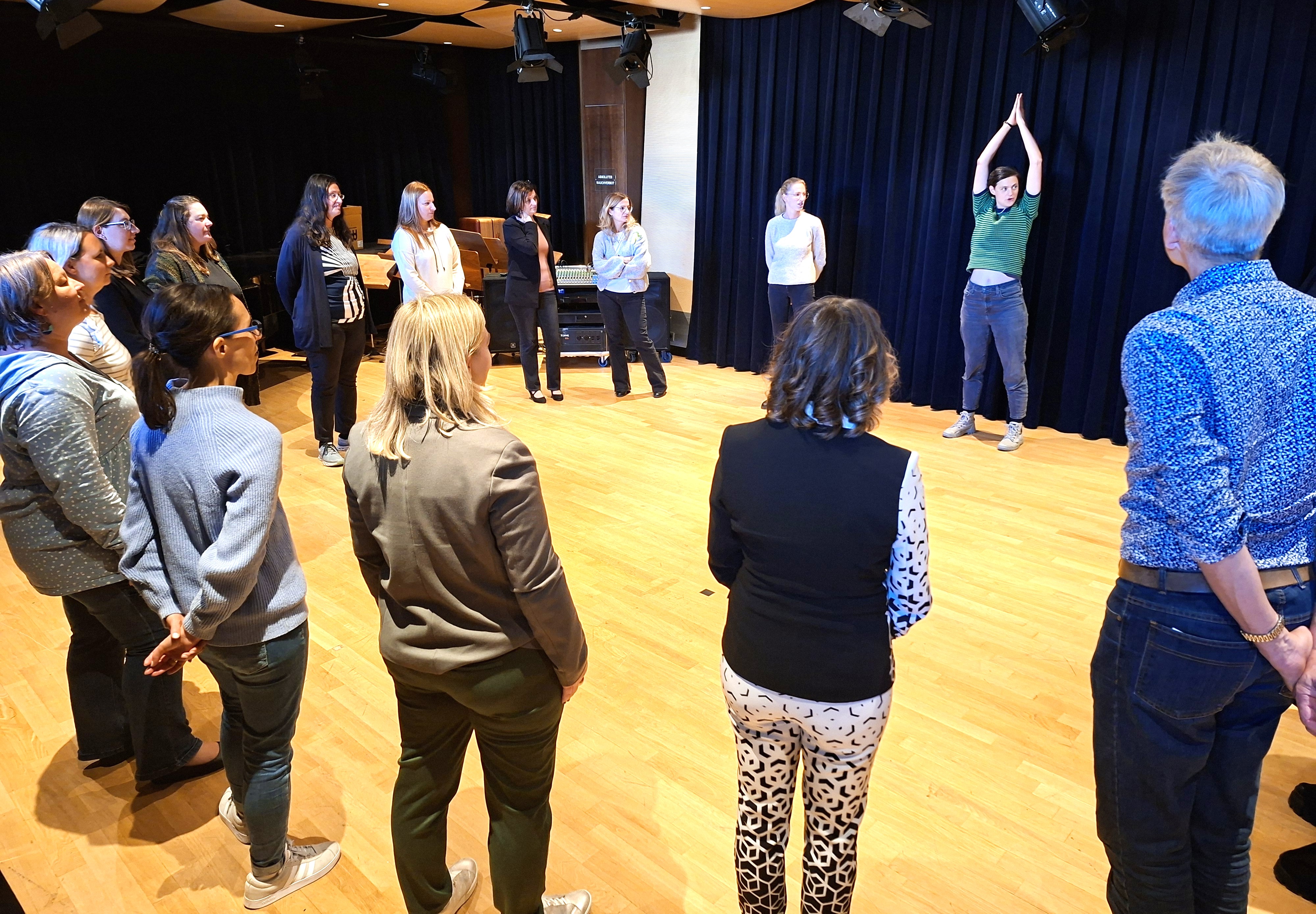 Nach der Führung hatten die Schulleiterinnen die Gelegenheit, sich in einem theaterpädagogischen Workshop unter der Leitung von Anna Manzano praktisch auszuprobieren. Der Bogen spannte sich von Übungen zur Selbsteinschätzung über Reaktionsübungen in Paaren bis zur Gruppenwahrnehmung mit und schließlich ohne Leiterin und bot viel Material für die eigene Unterrichts- bzw.