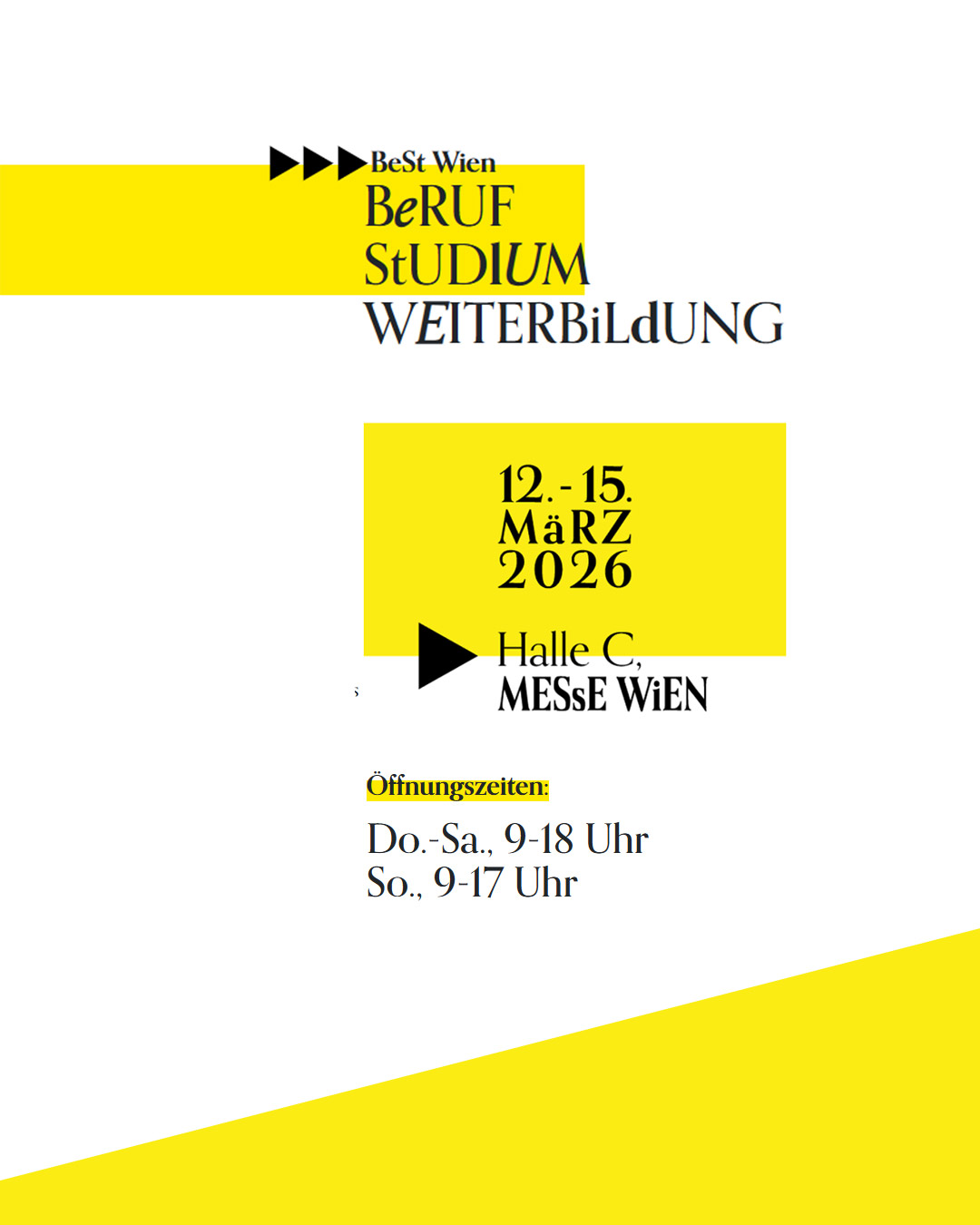 Die Halle C der Messe Wien wird von 12. bis 15. März 2026 zum Treffpunkt für alle, die ihre Zukunft aktiv gestalten möchten. Die BeSt ist Österreichs größte Messe für Beruf, Studium und Weiterbildung und bietet vier Tage voller Orientierung, Inspiration und neuer Perspektiven für Deinen ganz persönlichen Bildungsweg.