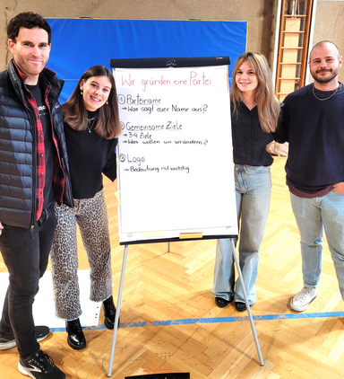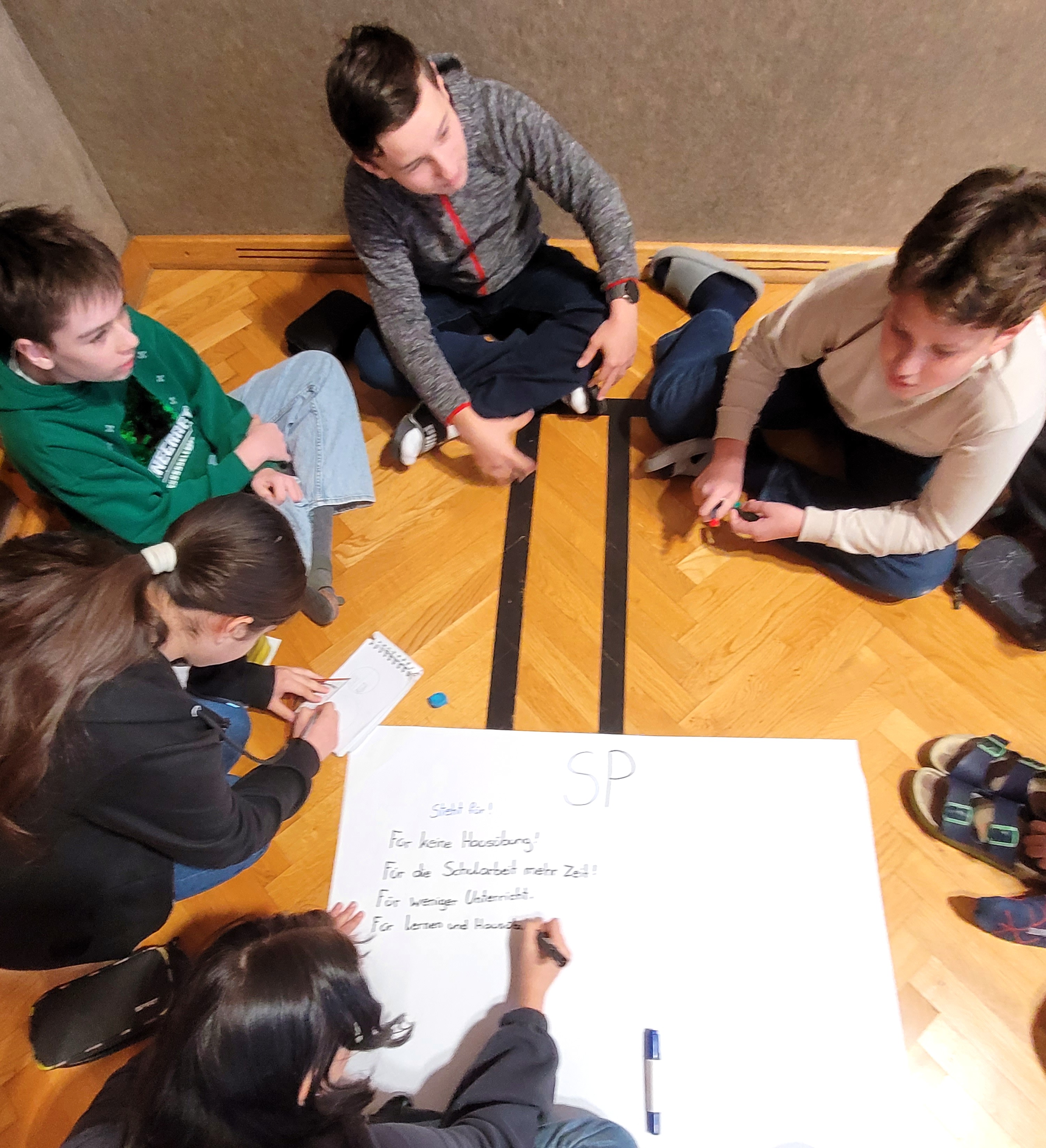 „Am Schluss baten wir die Schüler*innen noch um ein kurzes Feedback (Daumen hoch/runter). Das Ergebnis fiel sehr positiv aus. Ich fühlte mich sehr wohl und freue mich, Erfahrungen in einer Mittelschule gesammelt zu haben. Das Thema Demokratie und Bildung wurde spielerisch und passend für die Mittelschule vermittelt.“