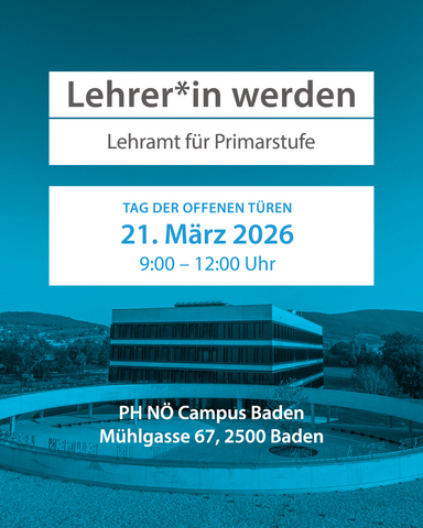 Am 21. März 2026 von 9:00 bis 12:00 Uhr öffnet die Pädagogische Hochschule Niederösterreich am Campus Baden ihre Türen und lädt alle Interessierten ein, das Lehramtsstudium Primarstufe und die Angebote im Bereich Elementarpädagogik persönlich kennenzulernen.