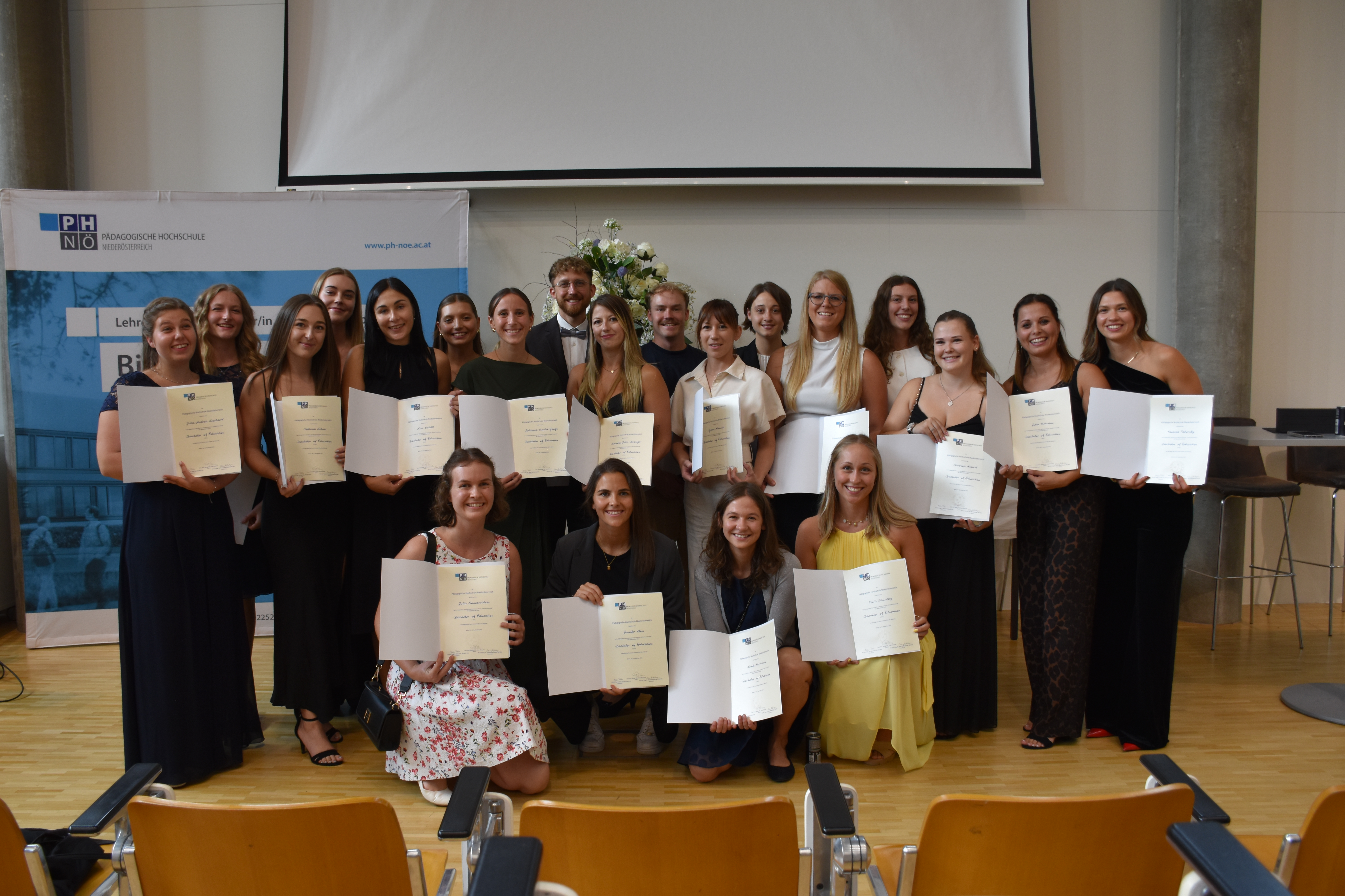 Das Lehramtsstudium Primarstufe setzt sich aus einem Bachelorstudium (BEd) und einem anschließenden Masterstudium (MEd) zusammen. Am Freitag versammelten sich die diesjährigen Absolvent*innen des Bachelorstudiums im großen Hörsaal der Pädagogischen Hochschule Niederösterreich (PH NÖ), um diesen Meilenstein gemeinsam mit zahlreichen Angehörigen und Freund*innen zu feiern. Die Feierlichkeiten wurden von Reden der beiden Vizerektorinnen der PH NÖ ‒ Edda Polz und Petra Heißenberger ‒ umrahmt.