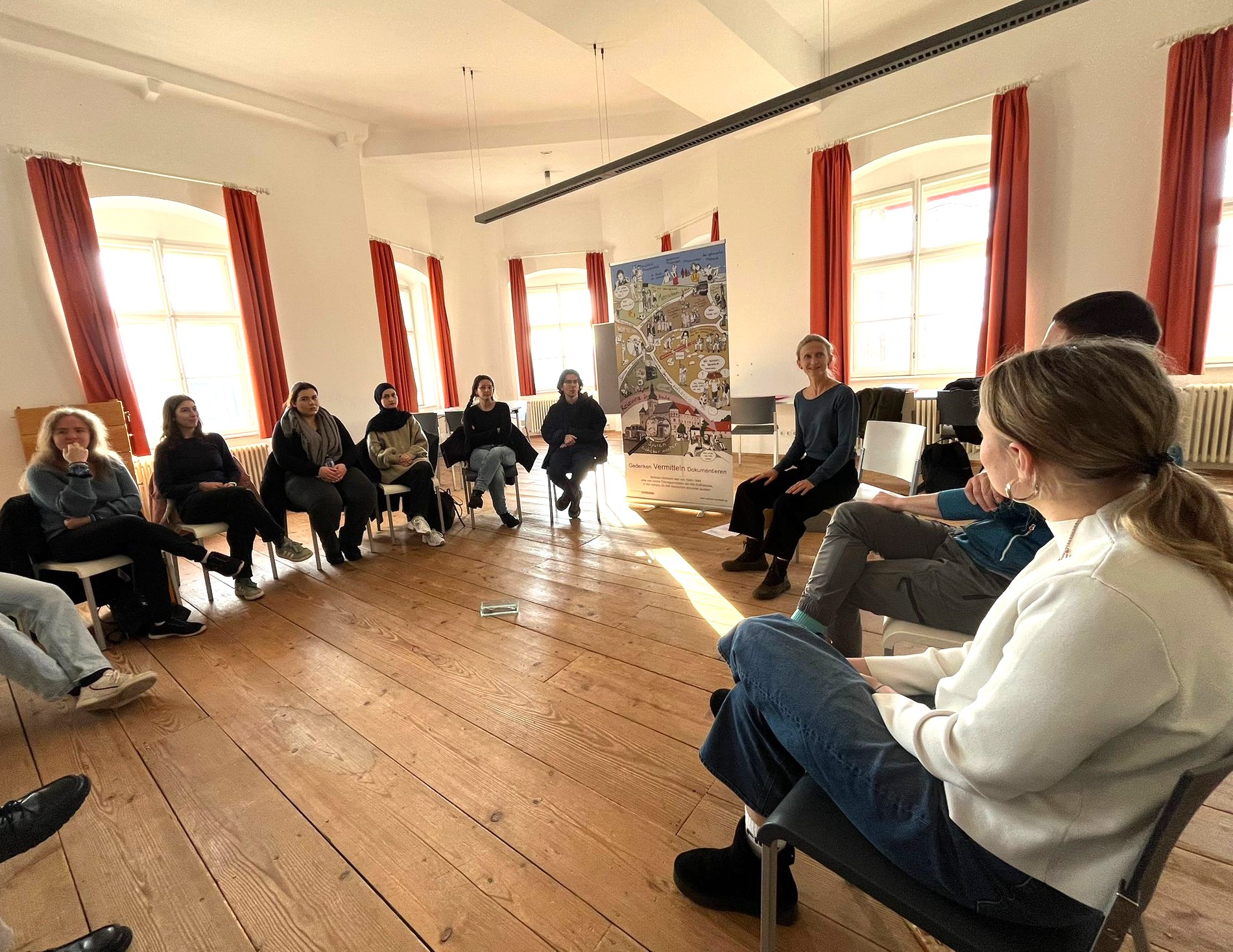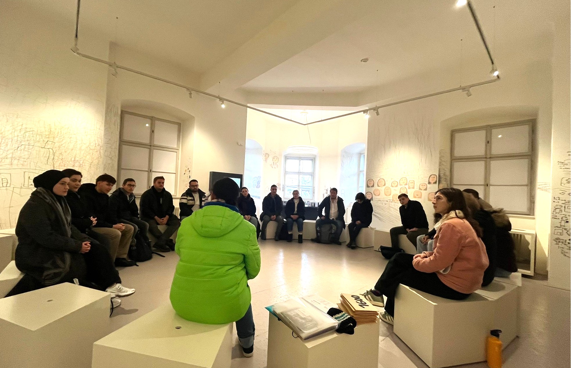 Schon beim Betreten des Renaissanceschlosses begegnete die Gruppe einem irritierenden Nebeneinander: repräsentative Architektur und die Ahnung einer Vergangenheit, die sich nicht abstreifen lässt. Guide Gabi nahm die Studierenden in Empfang, sammelte erste Eindrücke und rekonstruierte anschließend anhand eines Zeitstrahls die wechselvolle Geschichte des Hauses. In der Ausstellung „Wert des Lebens“ vertieften die Studierenden ihr Verständnis der NS-Eugenik. Sie analysierten Dokumente, mit denen Täter ihre Verbrechen zu verschleiern suchten. Gabi beantwortete Fragen, öffnete Kontexte und zeigte ein Hochzeitsfoto von Menschen, die während der NS-Zeit im Schloss arbeiteten – ein stiller Schock, der von jener Normalität erzählt, die sich mitten im Verbrechen fortsetzte.