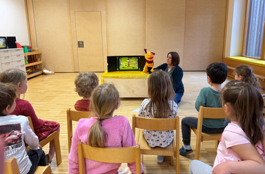 Michaela Rottmann aus dem Department Elementarpädagogik hat am 26. März 2026, dem österreichweiten Vorlesetag, im Kindergarten Biondekgasse in Baden mit Bücherwurm Balduin die Kinder begeistert.