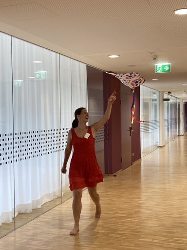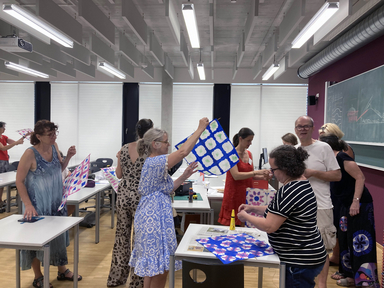 Der zweite Tag stand im Zeichen des praktischen Tuns, ein Ausdruck, der von allen Referierenden als besonders wichtig hervorgehoben wurde, wo doch die manuellen Fähigkeiten der Kinder merklich nachgelassen haben. In einem Workshop von Andrea Reiter gründeten die teilnehmenden Lehrenden eine Firma, um vom Einkauf bis zum Marketing alle Ebenen eines Unternehmens durchzuspielen, ein Workshop, wie er auch in der Volksschule durchgeführt werden kann. Die Gruppe entschied sich, aus textilen Stoffstücken und Kleinmaterial wie Borten, Spitzen, Knöpfen und Karabinern Schlüsselanhänger herzustellen und gleich den Seminarteilnehmer*innen zu verkaufen. Der Reingewinn ging an eine karitative Einrichtung im Raum Korneuburg. Von Rudi Hörschinger gab es in zwei Workshops Anleitungen und wichtige Tipps zur Herstellung von „gewebtem Papier“ im Stile von Victor Vasarely sowie Flugobjekte wie Drachen aus mit Shibori-Technik gefärbtem Material. Robert Grossegger untersuchte mit den teilnehmenden Lehrerinnen den Lehrplan genauer, wie viel informatische Bildung im Lehrplan enthalten ist und wie nun mit den textilen und technischen Bereichen am besten umzugehen ist.