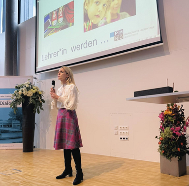 Claudia Pinkl, Leiterin der Praxisvolksschule der PH NÖ (PVS), wünschte den Erstsemestrigen ebenfalls alles Gute für den Studienstart und präsentierte einen Film über die Arbeit und die besondere Rolle der Praxisvolksschule innerhalb der Ausbildung.